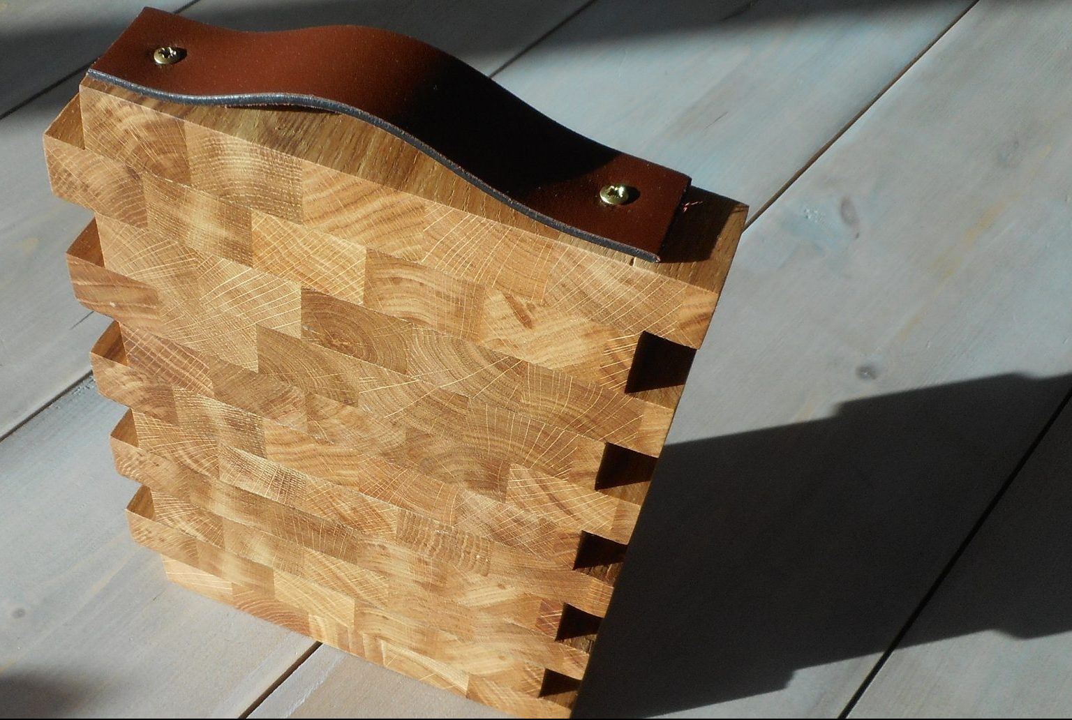 Beuken snijplanken (prijs per stuk) die als puzzel in elkaar passen. De planken zijn afgewerkt met een leren riempje waaraan ze opgehangen kunnen worden.